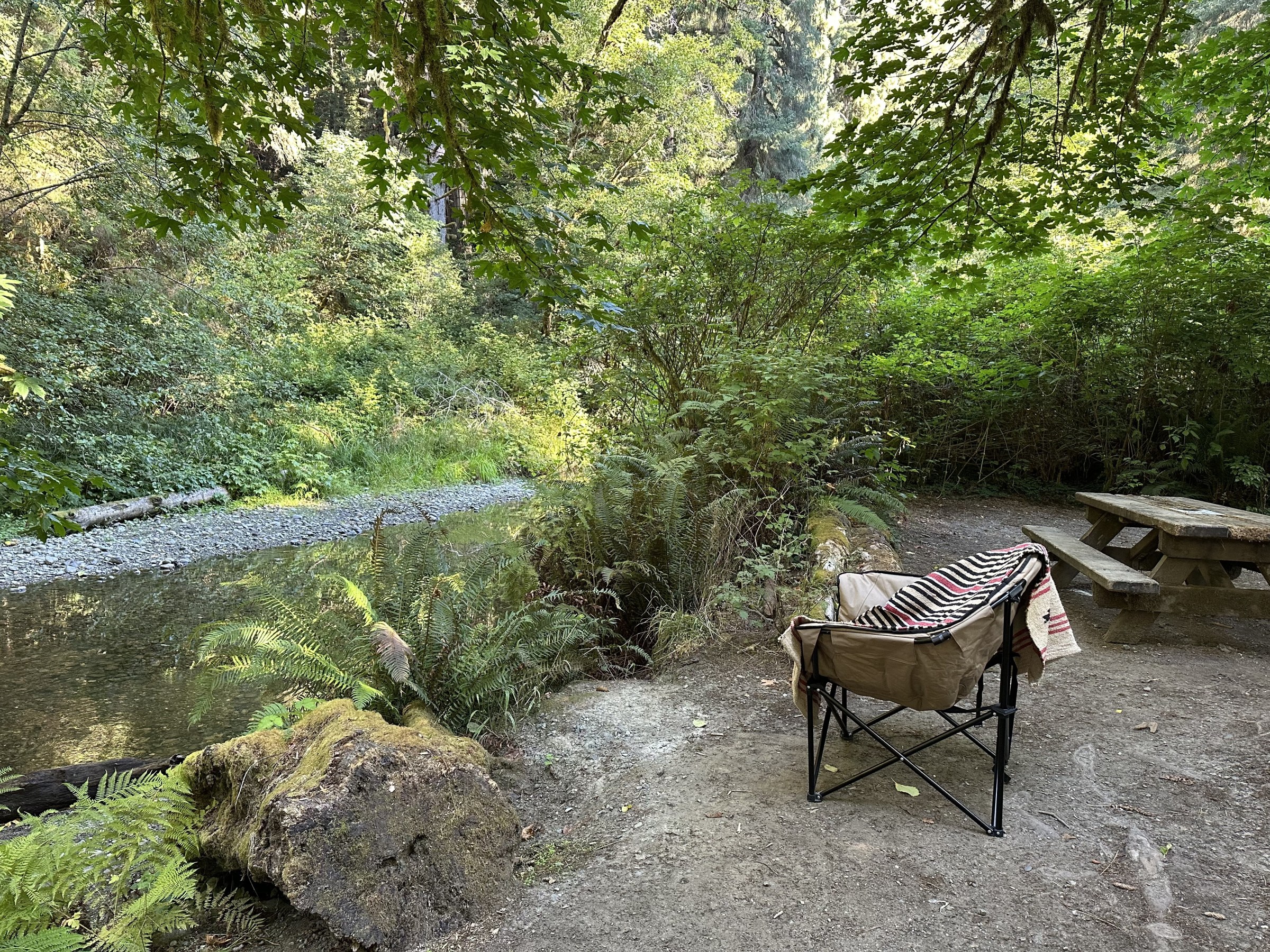 I’m at campsite No. 50 next to the creek at Elk Prairie Creek National and State Park, not far from the Oregon border. It’s the fourth time I’ve visited the park which is about a 12-hour-plus drive from the South Bay and like all the other times I’ve been here, I’m fairy-dusted by this enchanted cathedral’s grace, love and acceptance. This West Coast treasure asks nothing of her guests. She doesn’t need to be loved, admired, photographed or engaged with. She simply is—-a living, breathing reminder of the continuity, beauty, challenges, fortitude, strength and adaptation needed to strive and thrive on Planet Earth.