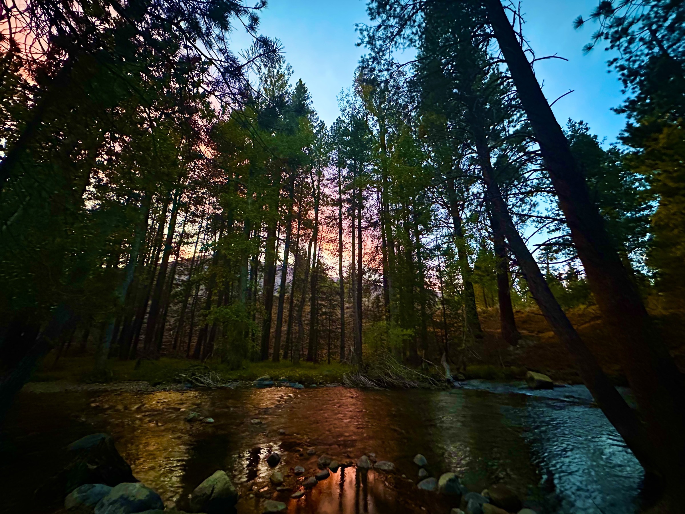 Postscript II: Call me crazy or not, but I saw a forest apparition. After almost two weeks staring, analyzing, reveling at the gold and crimson-sequined leaf transformation along the creek, I noticed a tree I’d never seen before shaped like an adobe statue of a Native woman. Her sienna arms were extended beyond the water as if reassuring the forest that she would protect them. The humans would be gone soon enough, October 13, when the campground closed for the season. Her presence, the gift of seeing her, made me emotional, grateful, and I was compelled to journal about my sighting.